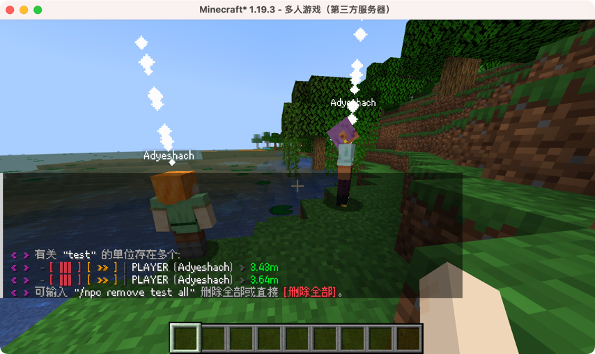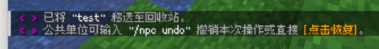 Adyeshach开始主要命令单位管理删除单位本页总览删除单位 作为核心命令,它的用法非常简单。只需输入 /npc remove <名称> 即可删除单位。 /npc remove test 插件会在编辑命令时建议出所有可用的单位名称: 删除后,单位将会消失: 提示对于公共单位,将会在删除后移送至回收站,以便于管理员进行恢复。 名称重复 若删除的单位名称与其他单位重复,插件将会进行二次确认: 你可以点击确认信息中的 红色 按钮精确删除,也可以点击 橙色 按钮传送至单位所在位置。 就近删除 你也可以省略单位名称,直接输入 /npc remove 来删除你所在位置附近(16)的单位: 警告如果附近(16)只有一个单位,将不会出现二次确认信息。