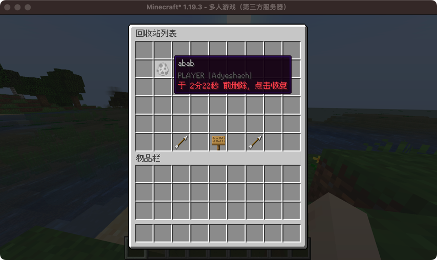 Adyeshach开始主要命令单位管理单位恢复本页总览单位恢复 从回收站中恢复单位,是重要的补救措施。 /npc undo [<uuid>] —— 注意这个命令只支持使用 UUID 检索。 提示恢复命令并不提供建议(补全)功能,因为补出来的你也不知道是谁。 快速操作 你可以使用 /npc undo 打开回收站,然后选择要恢复的单位。 点击牌子进行搜索,快速过滤你想要恢复的单位。 提示你可以搜索任何属于单位的信息,比如类型、名称、数据值等。